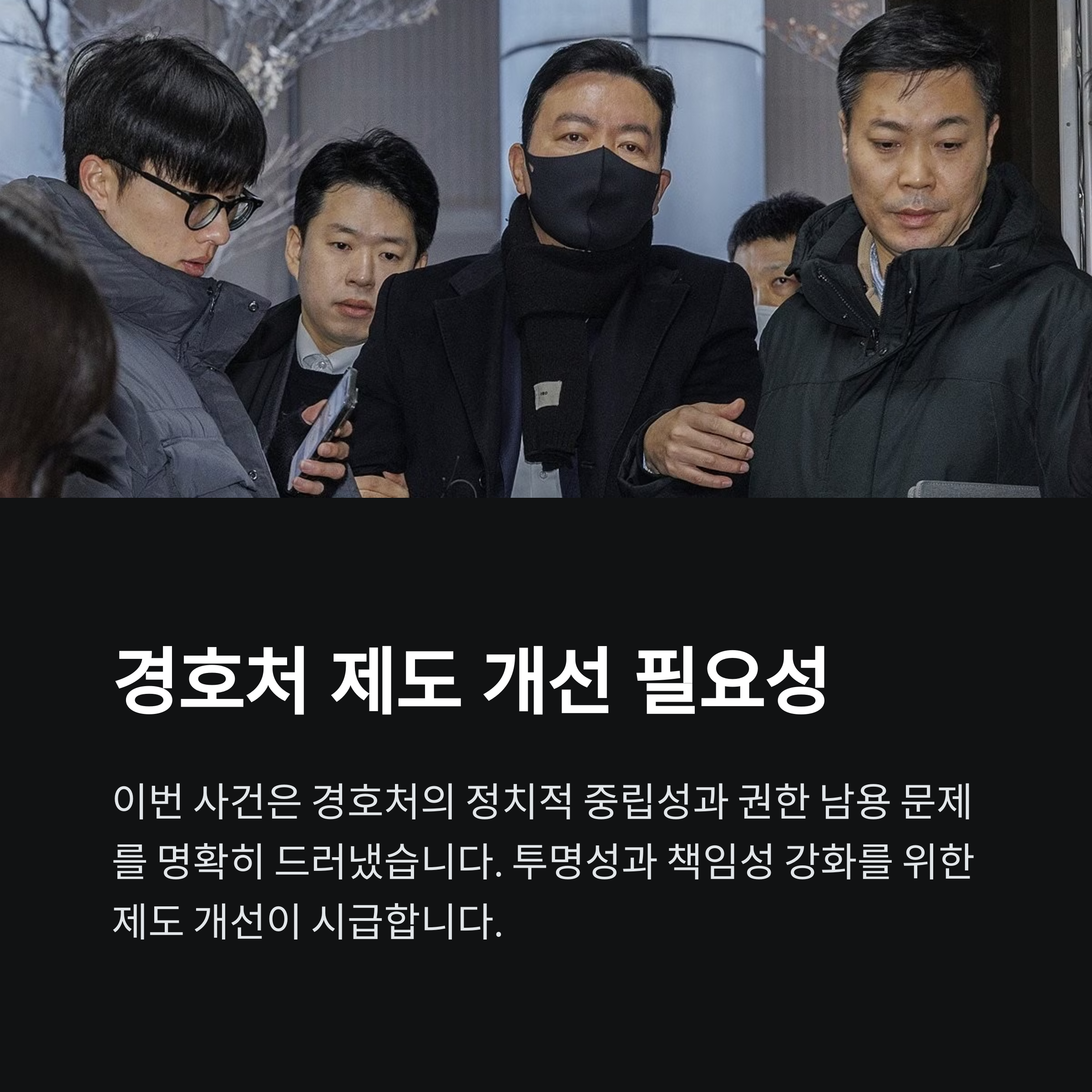 이 사건은 단순한 개인의 일탈이 아닌 경호처의 법적 권한 범위, 대통령 부부와의 관계, 그리고 권력기관의 독립성이라는 근본적인 문제를 제기했습니다. 특히 경호처가 대통령의 신변 보호라는 본연의 임무를 넘어 사법 절차를 방해했다는 의혹은 '경호처의 사병화'라는 비판으로 이어졌습니다.
