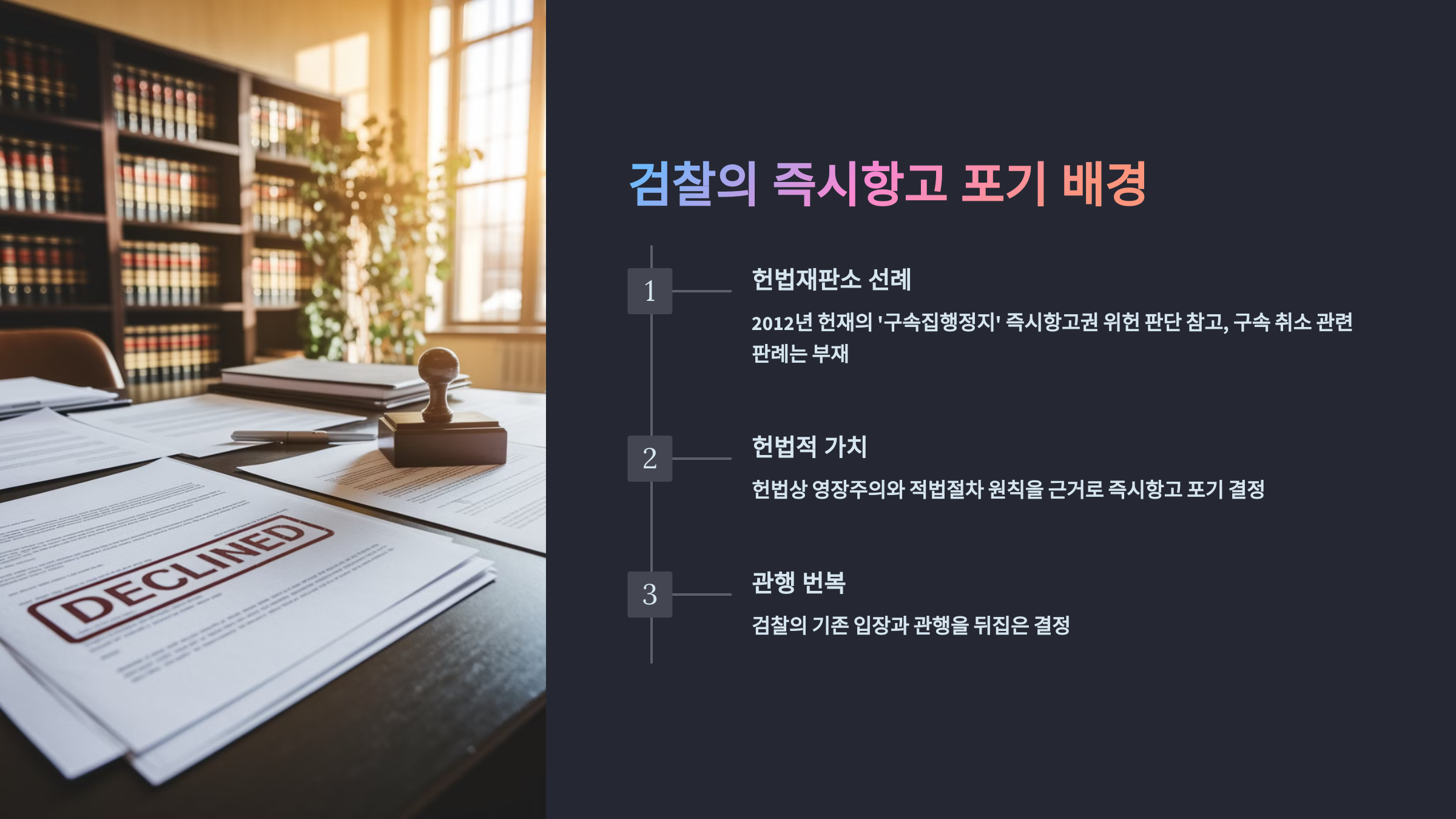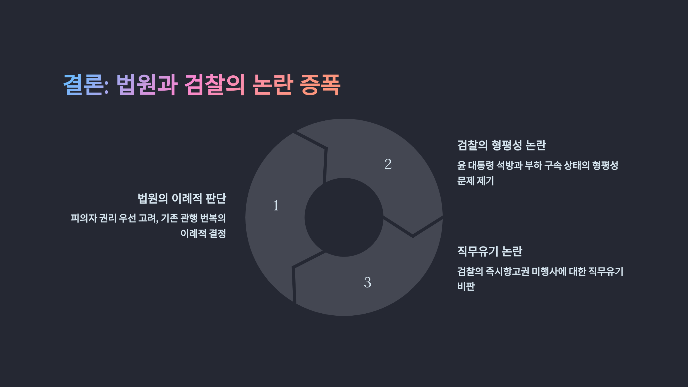 대검은 헌법상 영장주의 원칙과 적법절차를 종합적으로 고려해 즉시항고를 포기했다고 설명했습니다. 이는 윤 대통령 측 논리와 유사하며, 검찰이 기존 입장과 관행을 뒤집은 결정으로 평가됩니다.
